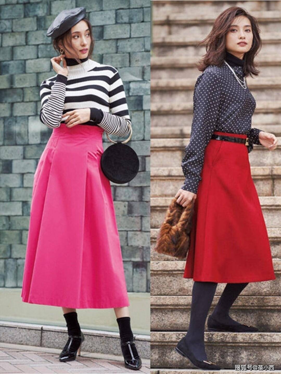 彩色裙装也有着显著的减龄效果,尤其是秋冬季节,温暖的色调如酒红、深绿等能让人看起来更加年轻充满活力。选择中长款或过膝的半裙,不仅能遮掩大腿根部,还能露出修长的小腿,使腿部线条更加优美。如果搭配上一双高跟鞋或短靴,更能提升整体的高度与瘦身效果。
